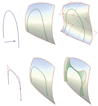 また、投影カーブとその結果のCoSとの間にも、コンストラクションヒストリ関係があります。投影カーブを変更すると、CoSも自動的に更新されます。同様に、2つのサーフェスの交差にあるCoSは、サーフェスを修正すると更新されます。(ヒストリがあるCoSは緑、ヒストリがないCoSは青で表示されます。)
