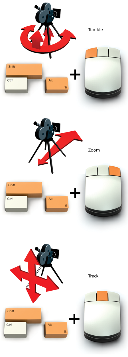 キーボードのモディファイア キーとマウス ボタンを組み合わせてマッスル メモリを構築すると、非常に効率的に Alias とやり取りすることができます。Shift、Ctrl、Alt(Windows)、またはShift、Control、Command(Mac)のキーはインタフェースの重要な要素です。作業を中断することなく、共通機能の切り替えを素早く行うことができます。ツールをクリックするか、あるいはモディファイアキーとマウスボタンを組み合わせて使用して、ウィンドウの内側のビューを操作します。