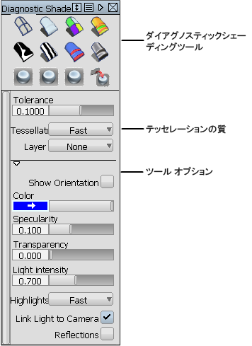これらのダイアグノスティック シェーディング ツールは、Diagnostic Shade ウィンドウ(ObjectDisplay