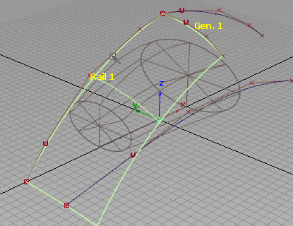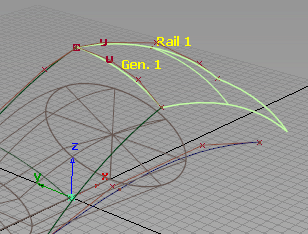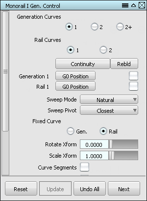 Rail Surface options ダイアログが開いている間、プロンプト ラインには「Select generation curve.」と表示されます。ツールは、そのオプションが編集されている間アクティブです。