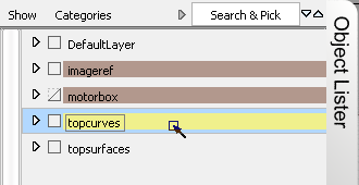 By Layer を選択します。 Object Lister は、シーンをモデリングレイヤ(By Layer)、または Canvases、Construction Entities、Group Nodes、その他すべてのジオメトリの順(By Object)に基づいて整理します。既定値は By Layer です。