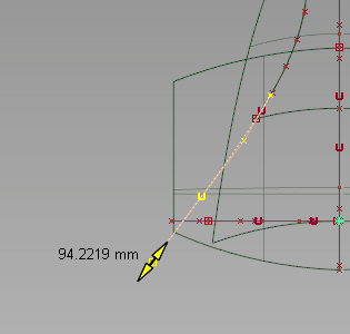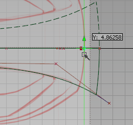 コンストラクション ヒストリは、ソース オブジェクトが修正されるときにオブジェクトを更新します。2 つ目の CV を最初の CV に合わせて、シンメトリのプレーンと垂直に動かすと、接線状態になります。