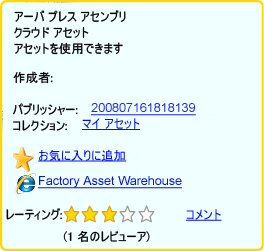 ユーザはアセットをパブリッシュする際に、自分のクラウドベース アセットを他のユーザと共有することができます。アセットが共有可能な場合は、他のユーザがそのアセットについて評価したりコメントすることができます。アセットのレーティングやコメントは、アセット ブラウザでも、Web ベースの Factory Asset Warehouse の[アセット情報]ページでも表示することができます。