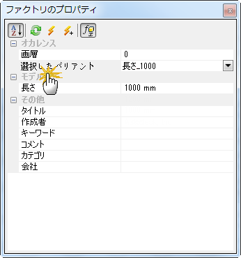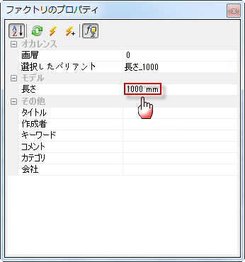 - バリアント パラメータ名の新しい値を入力して[Enter]キーを押すか、ファクトリのプロパティ ブラウザの一番上にある[更新]ボタン
