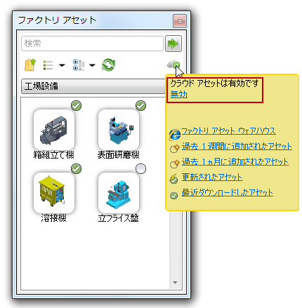 Factory Asset Warehouse を使用して切り替えることができます。ローカル アセットまたはクラウド アセットのパブリッシュに関する詳細については、Inventor Factory ヘルプ トピック「