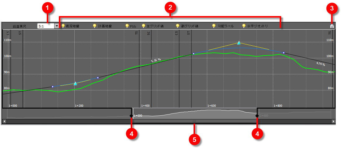 [縦断ビュー]パネルでは、道路の垂直ジオメトリを表示したり操作することができます。道路の縦断の表示方法をコントロールするためのさまざまなツールがあります。