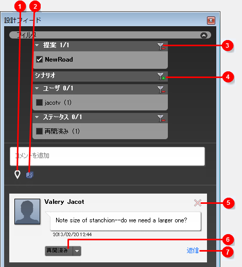 モデル、提案、パブリッシュされたシナリオに[設計フィード]コメントを追加することができます。ビューアはコメントに返信したり、コメントを追加することができます。
