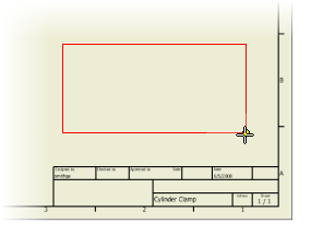 - 文字を図面に配置する際には、文字ブロックによって占有される領域の場所と、おおよその初期サイズを指定する必要があります。表題欄の上部の何もない領域に、カーソルを移動します。次の図に示すように、長方形をクリックしてドラッグします。