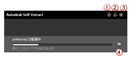 ファイルを解凍するには、すべてのファイルのダウンロードが完了した後に、.EXE ファイルをダブルクリックします。オートデスク製品が 4 GB より大きい場合は、複数の .EXE ファイルにパッケージ化されます。いずれか 1 つのファイルをダブルクリックすると、解凍が始まります。1 回の操作ですべてのファイルが解凍されます。Self-Extract は、解凍されるファイルの解凍先フォルダを確認するよう求めてきます。解凍先フォルダは、変更することができます。ファイルが解凍されている間、下図のコントロールを使用することができます。