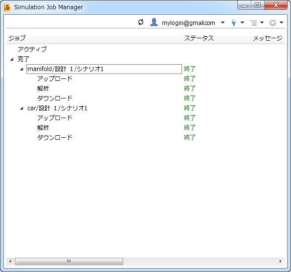 [ジョブ]リストは、ジョブの階層リストです。各製品名の下の時間ベースのグループにより、ジョブが、アクティブであるか、最近完了したか、または完了してから長期間経過しているかに基づいて分類されます。各ジョブには、シミュレーション プロセスの各ステージのステータスと履歴を表示するいくつかのサブブランチがあります。