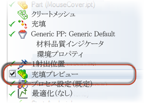 この手順では、[充填プレビュー]ツールを使用して、異なる射出位置での充填パターンを確認します。