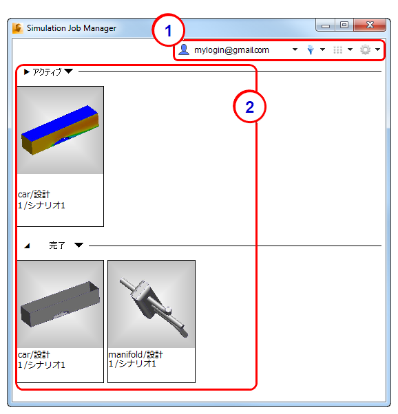 Simulation Job Monitor では、Autodesk® 360 のジョブがモニタ フレームに表示されます。このフレームは、[アクティブ]ジョブと[完了]ジョブの領域に分かれています。ツールバーの[サイズ]ボタンを使用して、ジョブをサムネイル イメージで表示するか、リストビューで表示するかを選択できます。