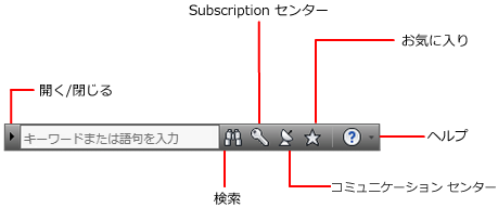 情報センターを使用して製品関連のヘルプを検索したり、Subscription サービスを利用するために Subscription センター パネルを表示したり、製品に関する情報やアップデートを得るために[コミュニケーション センター]パネルを表示したり、保存したトピックにアクセスするために[お気に入り]パネルを表示することができます。