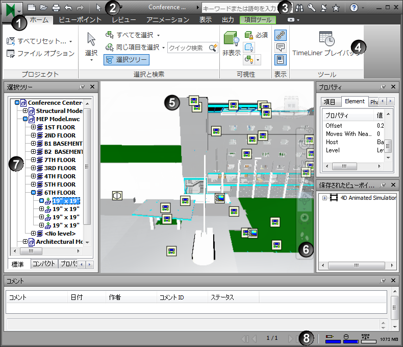 Autodesk Navisworks インタフェースは、理解しやすく、簡単に使用することができます。ユーザの作業方法に合わせてアプリケーション インタフェースを調整することができます。たとえば、使用頻度の低いドッキング可能ウィンドウを非表示にし、画面をすっきりさせることができます。リボン上およびクイック アクセス ツールバー上のボタンを追加または削除することもできます。