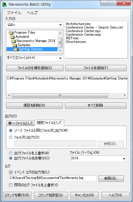 または、[ファイルの仕様を追加]ボタンをクリックすることもできます。これにより、Autodesk Navisworks は選択したフォルダにあるファイルを変換します。[ファイルの種類]メニューで選択したオプションによって、どのファイルが変換されるかが決まります。