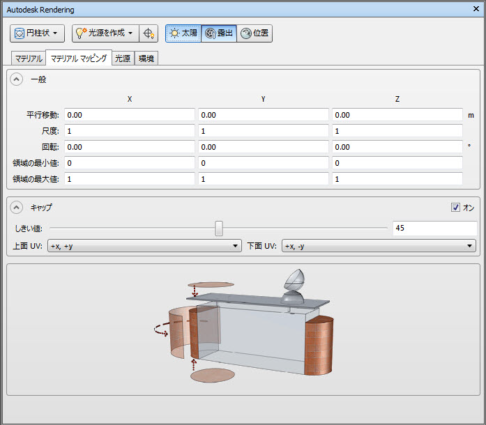 [キャップ]チェック ボックスでは、円柱キャップが円柱の側面とは異なる変換でテクスチャをマッピングするかどうかを決定します。[しきい値]では、キャップまたは側面のマッピングを使用するかどうかを決定するために使用される点とシリンダの軸の間の角度です。既定値では、45 度が使用されます。キャップ方向([上面 UV]および[下面 UV])は、キャップ上のテクスチャ座標の方向を、ボックス マッピングの方向パラメータと同じように指定します。