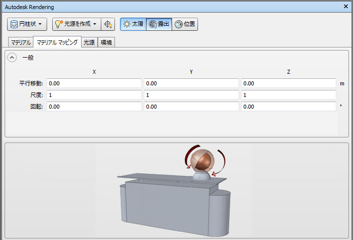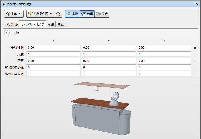 マテリアルマッピングは、3D 座標および法線をを 2D テクスチャ座標(UV)に変換する方法を定義します。これは、テクスチャマップから、色などを確認する場合などに使用されます。各固有のマッピングは、マッピングを行う方法により、「レシピ」が異なります。3D 点をテクスチャ座標に変換する特定マッピング タイプのレシピを適用する前に、[一般]セクションの[移動]、[尺度]、および[回転]フィールドで、3D 座標および法線に適用する変換を定義します。[領域の最小値]と[領域の最大値]の各フィールドの値は、多くのマッピング レシピで使用され、座標空間(X、Y、Z)を 0 ~ 1 (最小値と最大値)にマッピングする範囲を決定する場合に使用されます。