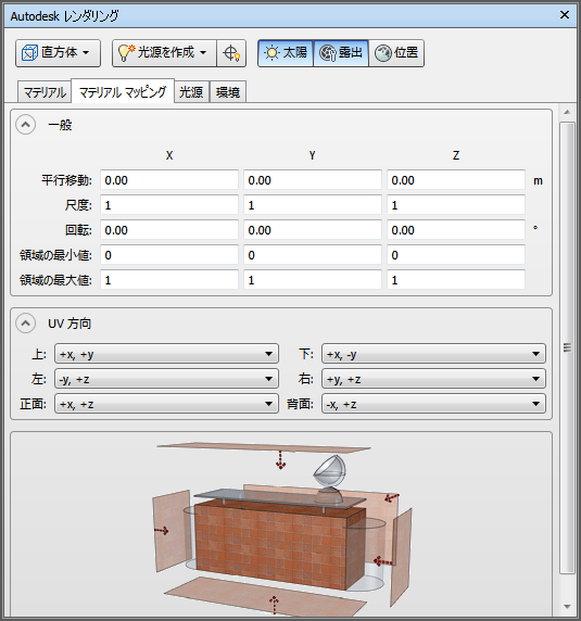 このパネルでは、フィールドはコンテキスト依存です。詳細は、「マテリアル マッピングを調整する」を参照してください。