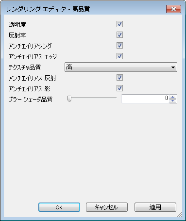 選択したレンダリング スタイルを編集するには、パレットでスタイルをダブルクリックします。[レンダリング エディタ]ダイアログ ボックスが表示されます。エディタはレンダリング スタイルのタイプごとに異なります。ここには[高品質]エディタを示します。