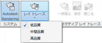 3 つのレンダリング スタイルが Autodesk Navisworks で使用可能です。これらにアクセスするには、リボンの[レイ トレース] 分割ボタンをクリックします([レンダリング ]タブ