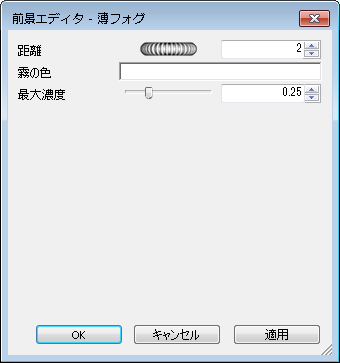 前景エフェクトの追加方法は、背景エフェクトの追加方法と同様です。パレットでエフェクトをダブルクリックし、[前景エディタ]を開きます。エディタは前景のタイプごとに異なります。ここには[フォグ]エディタを示します。