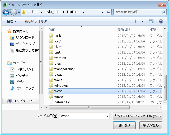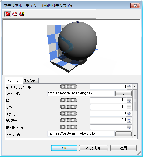 - [マテリアル]タブ(または、[開発者]プロファイルの場合は[色]タブ)で、[ファイル名]テキスト ボックスの横の[参照]ボタン([...])をクリックします。[イメージファイルを開く]ダイアログ ボックスが表示されます。