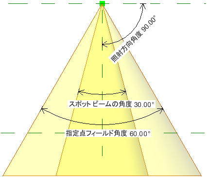 - ビーム角度: 照明強度がピーク強度の 50% に到達する角度。0 度から 160 度までの値を入力してください。小型の明るいスポットを作成するには、入力する値を小さくします。