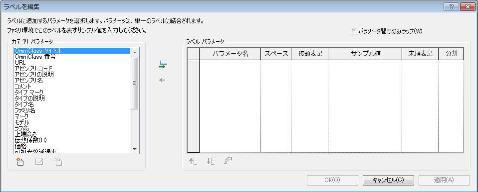 [カテゴリ パラメータ]ウィンドウには、タグ タイプに関連するラベル パラメータが入っています。[ラベル パラメータ]ウィンドウには、ラベルに表示される[カテゴリ]パラメータが入っています。通常、これは単一のパラメータですが、複雑で連結されたラベルを列挙することができます。