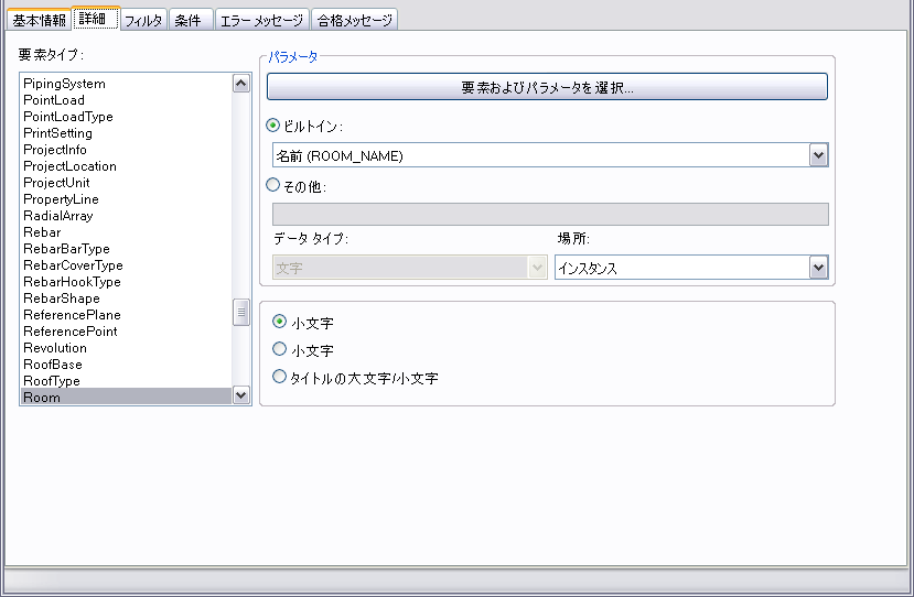 要素パラメータの大文字/小文字チェックは、選択された要素パラメータの大文字/小文字を確認します。