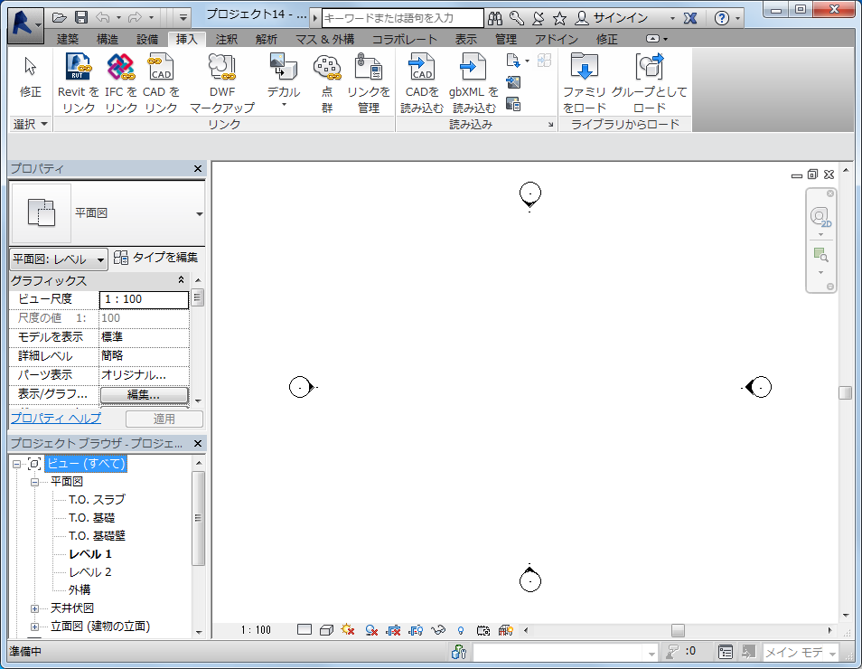 Revit ウィンドウの作図領域には、現在のプロジェクトのビュー、シート、および集計表が表示されます。プロジェクト内のビューを開くと、既定では、開いている他のビューの上で、作図領域のビューが表示されます。他のビューは開いたままで、現在のビューの下に表示されます。[表示]タブ [ウィンドウ]パネルのツールを使用して、作業スタイルに合うようプロジェクト ビューを整列します。