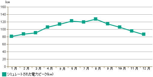 [結果および比較]ダイアログで Autodesk® 360 Energy Analysis を確認する際、このチャートにはプロジェクトの月別の推定電力ピーク需要が表示されます。ピーク需要は最大瞬間電気負荷です。