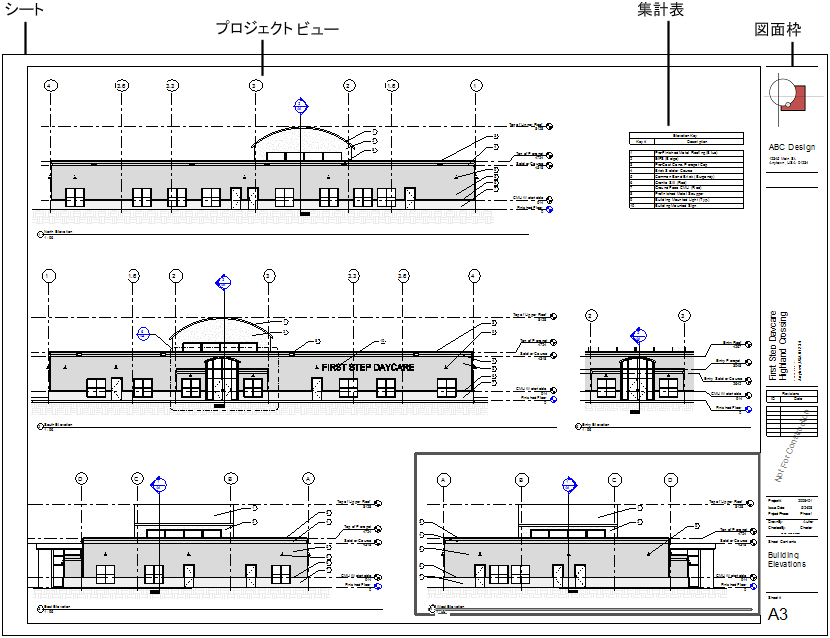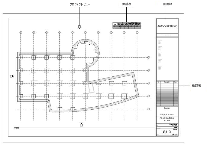 シート(図面シート)とは、設計図書セットの個々のページです。Revit では、設計図書セットの各シートにシート ビューを作成します。次に、各シート ビューに複数の図面または集計表を配置することができます。