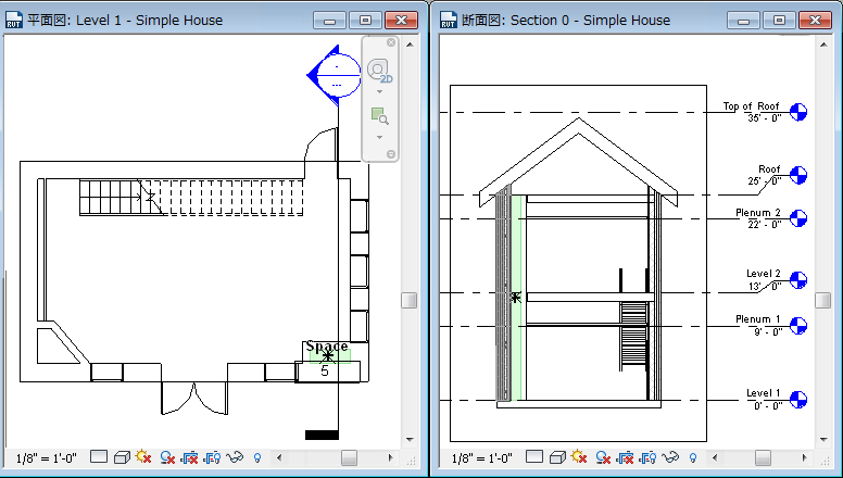 - スペースを配置する断面図および平面図以外のすべてのビューを閉じ、キーボードで WT と入力して 2 つのビューを並べて表示します。