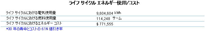 ライフ サイクルにおけるエネルギー コスト | 解析対象モデルで 30 年間に使用される燃料使用量の推定値です。 |