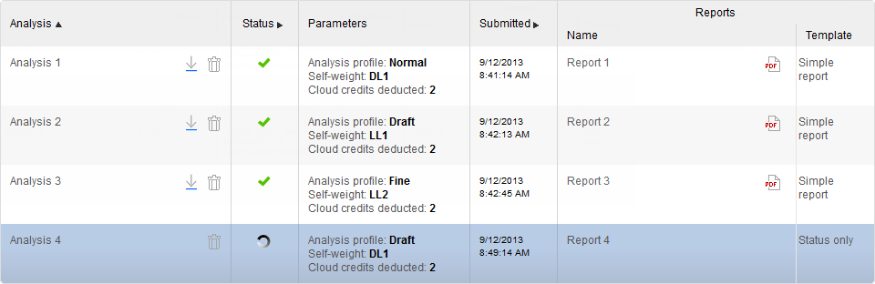 結果は、Autodesk® 360 Structural Analysis の Web サイトで、定義されている解析レポートの形式でも利用できます。レポートは HTML 形式または PDF 形式で表示できます。結果をダウンロードしてローカルに保存することもできます。