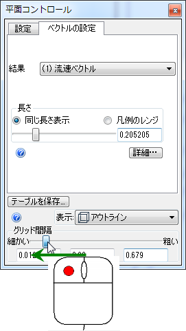 5. [平面コントロール]ダイアログの[グリッド間隔]スライダを[細かい]に向けてドラッグします。