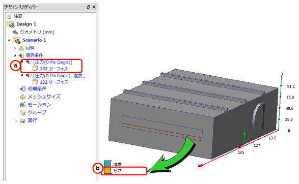 6. 圧力の境界条件が流出口に正しく適用されているか確認するために、デザイン スタディ バーと流出口サーフェスの色付きのストライプをチェックします。
