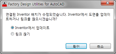 링크되어 있는 Inventor Factory 배치가 수정된 AutoCAD 2D 도면을 열면 다음 대화상자가 표시됩니다. 3D 배치의 변경 사항을 도면에 반영하려면 확인을 클릭합니다.