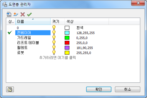 도면층을 현재 도면층으로 설정하려면 도면층 리스트에서 도면층 이름을 선택하고 이 버튼을 클릭합니다. |