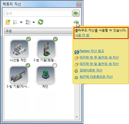 Factory 자산 창고를 사용하여 공유 기능을 설정하거나 해제할 수 있습니다. 로컬 또는 클라우드 자산 게시에 대한 자세한 정보는 Inventor Factory 도움말 항목:
