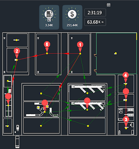 숫자가 표시된 빨간색 플래그가 스테이션 옆에 표시됩니다. 이 플래그는 스테이션 집약도, 즉 해당 스테이션을 통과하는 재료 흐름이 얼마나 많은지를 나타냅니다. 숫자가 표시된 플래그는 변경 시 영향력이 가장 큰 영역을 안내해 줍니다.