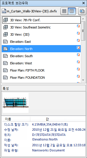 시트/모형 팔레트에는 다중 시트 파일에 있는 시트와 모형이 모두 나열되어 있습니다. 팔레트 상단의 레이블은 Autodesk Navisworks에 현재 열려 있는 파일을 나타냅니다. 시트/모형은 리스트 뷰 또는 축소판 뷰로 표시할 수 있습니다. 기본적으로, 표시 순서는 원래 파일에 있는 순서와 동일합니다. 현재 선택된 모형/시트는 음영 처리된 배경으로 표시되고, 장면 뷰에 현재 열려 있는 모형/시트는 검은 그래픽 경계로 표시됩니다. 다중 시트 파일을 열 때 일부 시트/모형이 Autodesk Navisworks에서 사용할 수 있도록 준비되지 않았을 수 있습니다. 준비가 필요한 시트/모형에는 준비