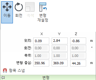 변형 패널에는 모형의 제한된 특정 영역을 검토하는 데 집중할 수 있도록 단면 평면 또는 단면 상자의 위치 및 크기를 조정할 수 있는 도구가 포함되어 있습니다. 이러한 작업은 이동, 회전 및 축척 기즈모를 사용하거나, 제공된 필드에 숫자 값을 입력하여 수동으로 수행할 수 있습니다.
