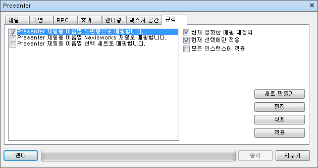 Presenter 창의 규칙 탭에서는 각 도면층, 그룹 또는 구성 요소에 끌어 놓지 않고도 특정 사용자 정의 기준에 따라 모형에 재질을 적용할 수 있습니다. 예를 들어, 재질을 각 바닥재에 수동으로 끌어 놓지 않고도 바닥에 깔리는 모든 도면층에는 "바닥재"라는 재질을 할당할 수 있습니다. 모형을 업데이트할 때마다 모든 항목에 재질을 일일이 수동으로 다시 적용하지 않고 간단히 규칙만 다시 적용합니다.