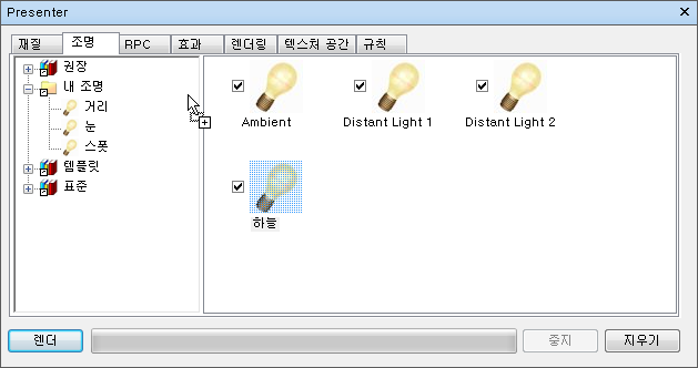 탭에서 오른쪽 창의 조명 효과를 클릭하고 마우스 포인터가 작은 더하기 모양이 될 때까지 왼쪽 창의