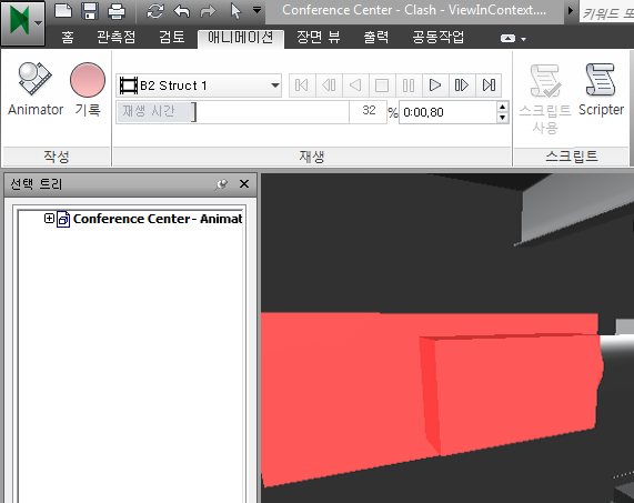 - 리본에서 애니메이션 탭을 클릭합니다. 재생 패널의 재생 위치 슬라이더가 정확한 간섭 발생 지점으로 이동합니다. 슬라이더를 이동하여 간섭 전후에 바로 발생하는 이벤트를 조사할 수 있습니다.