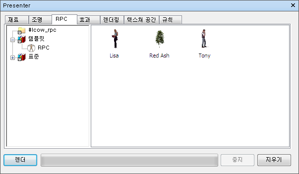 재질, 조명 및 렌더링 탭과 마찬가지로 RPC 탭에는 왼쪽 창에 아카이브, 오른쪽 창에 팔레트가 나타납니다. 이 탭에서는 RPC를 설정합니다.