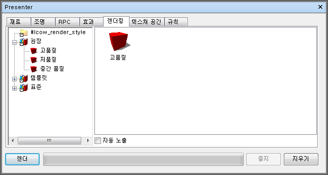재질, 조명 및 효과 탭과 마찬가지로 렌더링 탭에는 왼쪽 창에 아카이브, 오른쪽 창에 팔레트가 나타납니다. 이 탭에서는 장면을 렌더링할 스타일과 방법을 선택할 수 있습니다. 각 아카이브에는 여러 개의 렌더 스타일이 있습니다.