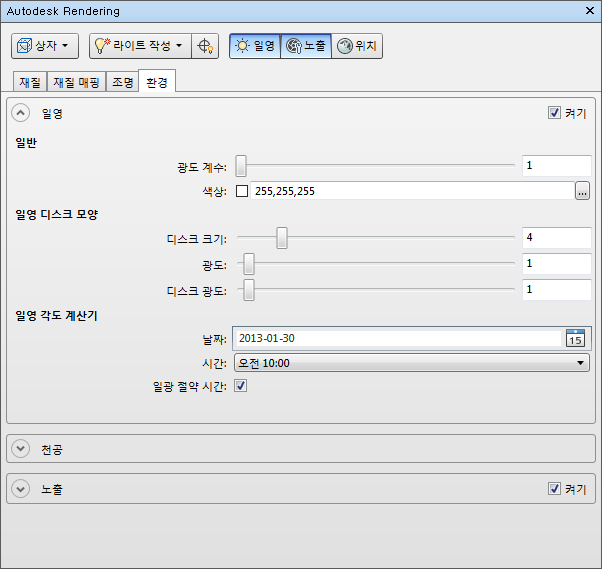 환경 탭을 사용하여 일영 및 천공 특성과 노출 설정 작업을 수행할 수 있습니다.
