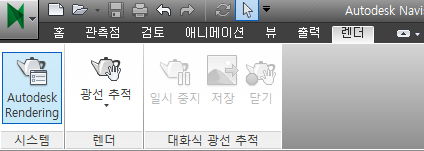 도구 패널 및 리본의 렌더 탭에서 Autodesk Rendering 도구에 액세스할 수 있습니다.